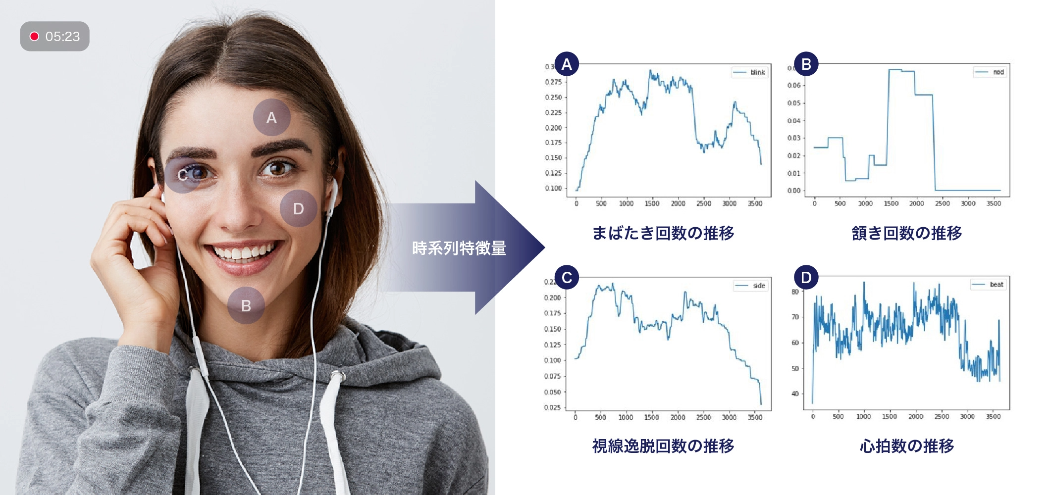 動画内のまばたき、頷き、視線、心拍から特徴量を解析