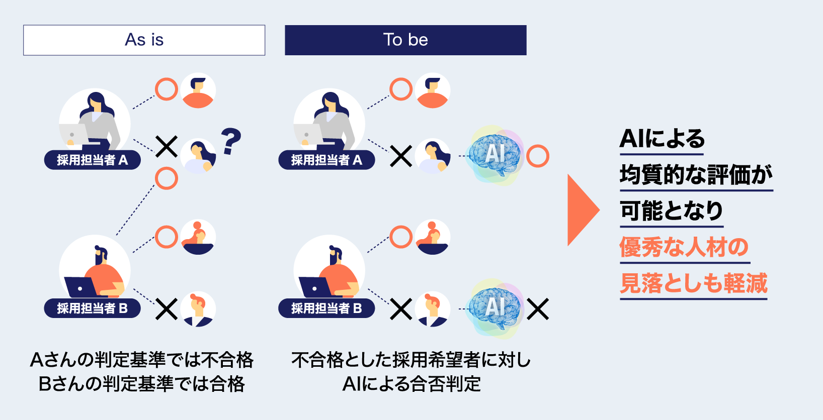 パターン①②に共通する補足 AIだけでの採用判定は推奨しておりません。最終的な採用判定は人手によるものを推奨しております。 お客さまにて、AI倫理のリスクを考慮して方式を決定いただきます。