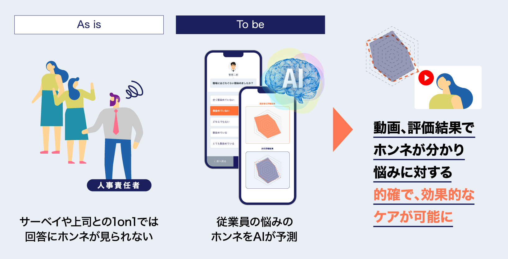 従業員の悩みを言語だけではなく、表情などからも見える化し、悩みに適したケアを行い離職を減らすためのシナリオ。