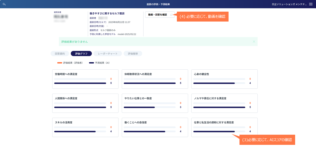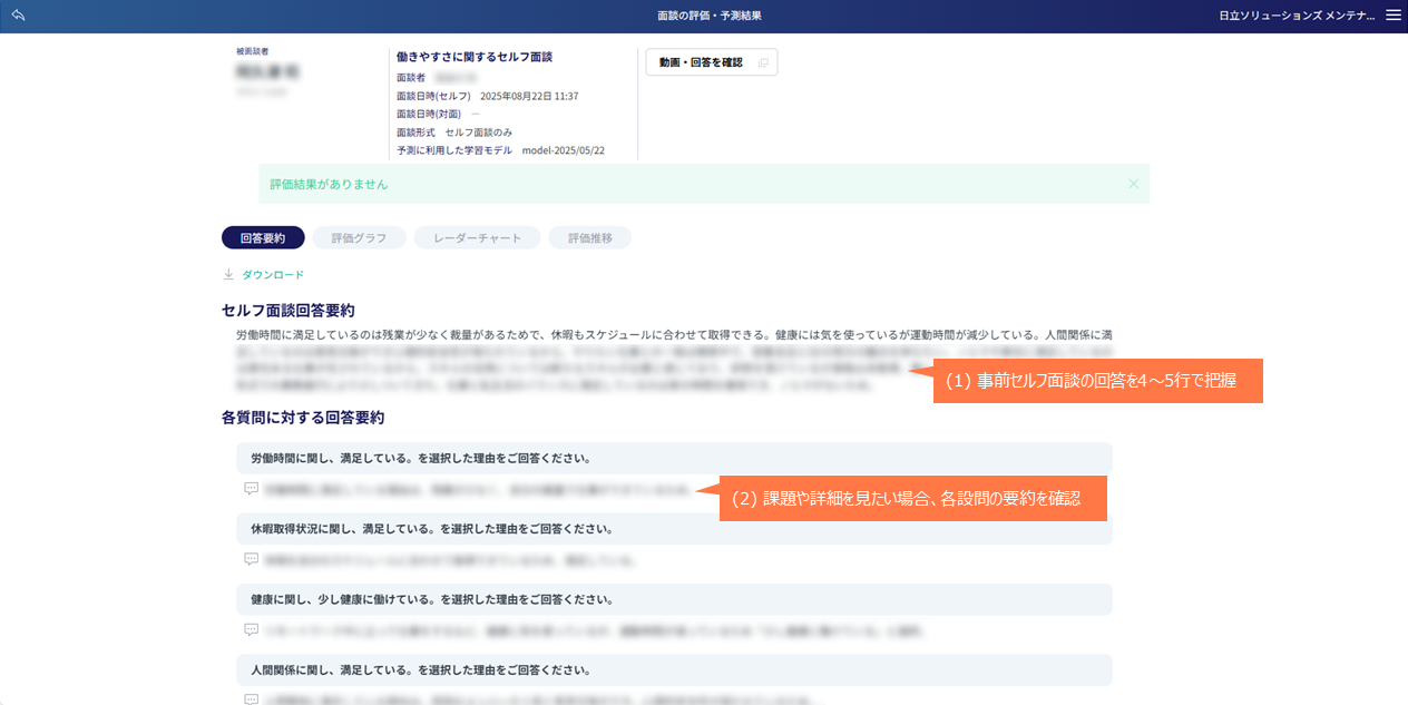 また、AIの評価予測により、回答要約から判断しづらい項目を確認することも可能です。