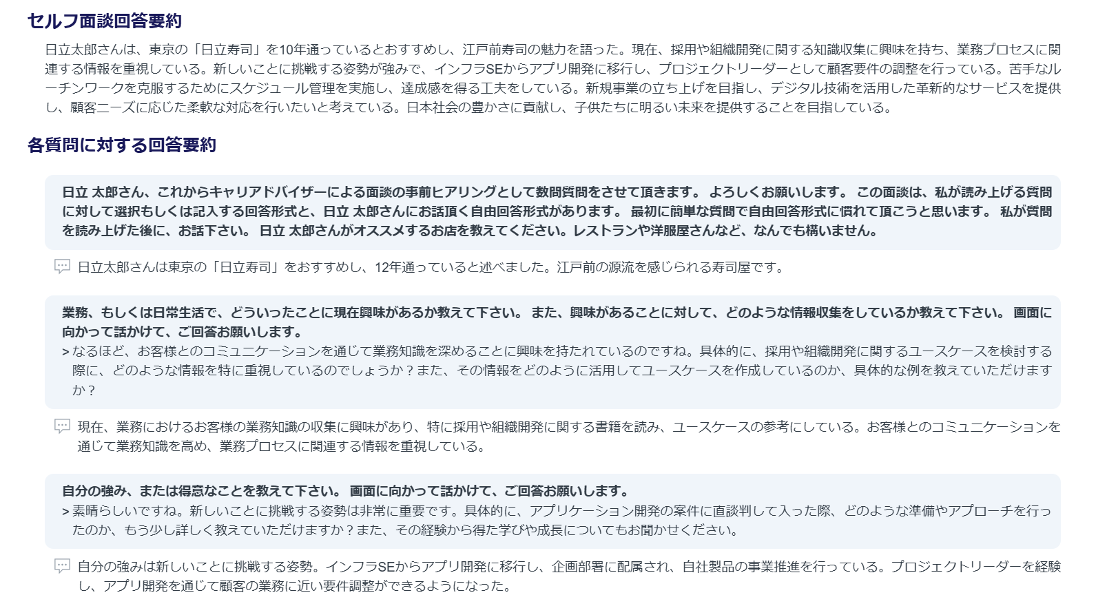 さらに、発話の内容を要約することも可能です。要約文を見ることで、キャリアカウンセラーは従業員の考えを効率よく把握できます。ヒアリングシートでは時間をかけて回答を準備するため、きれいな回答を準備しようとし、本心と遠い回答となりがちです。本モデルでは、アバターからの質問に、その場で回答する必要があるため、本心に近い回答が出やすい効果も期待できます。