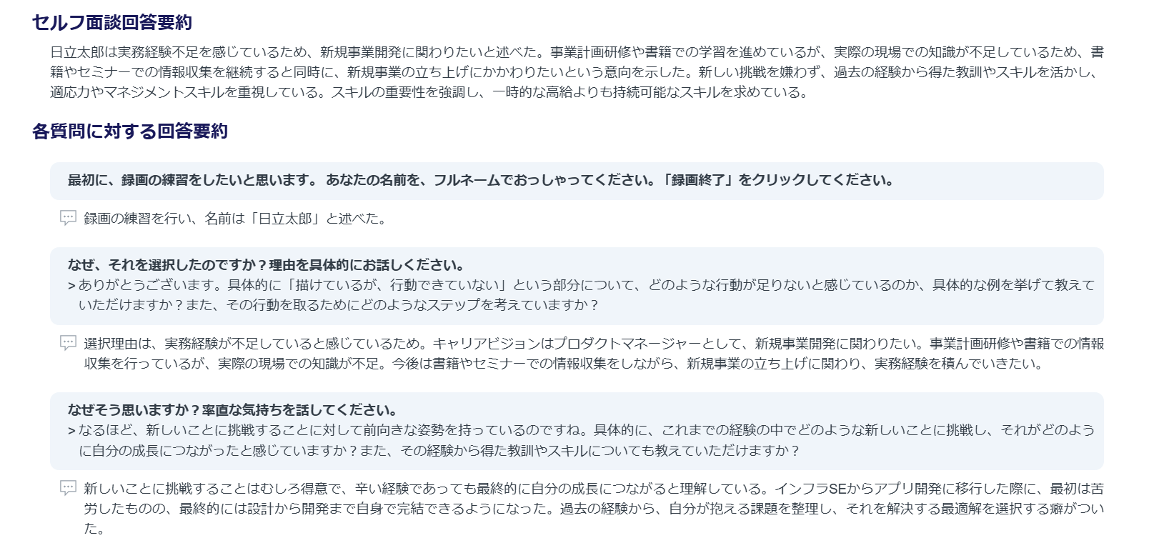 『アンケート→考える→記述』では内省は深まりずらく、『質問→考える→発言→対話(AI)→考える』ことで内省を深めることが可能です。また、成人発達理論では、内省と対話が必要だと言われます。他人に自分の考えを話すことで、考えが構造化されて現実的になり、行動に移すことができます。本面談は、内省したことを誰かと対話(OUTPUT)することで、スパイラルに成長を続けていくことを支援します。