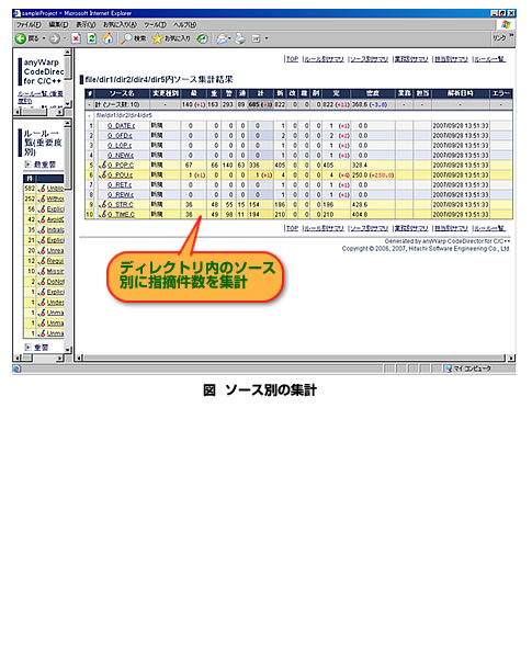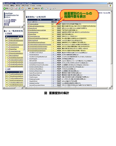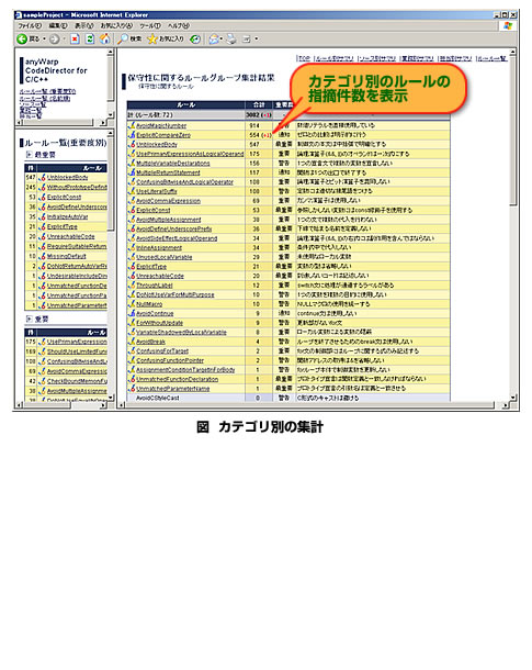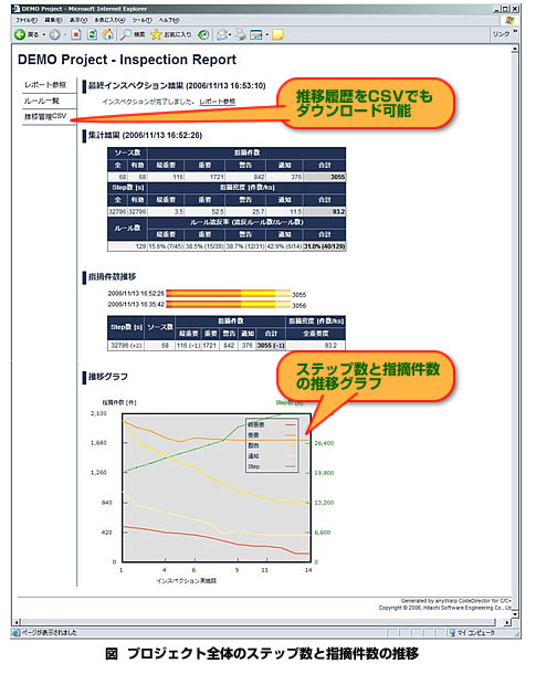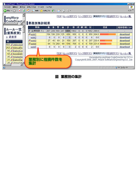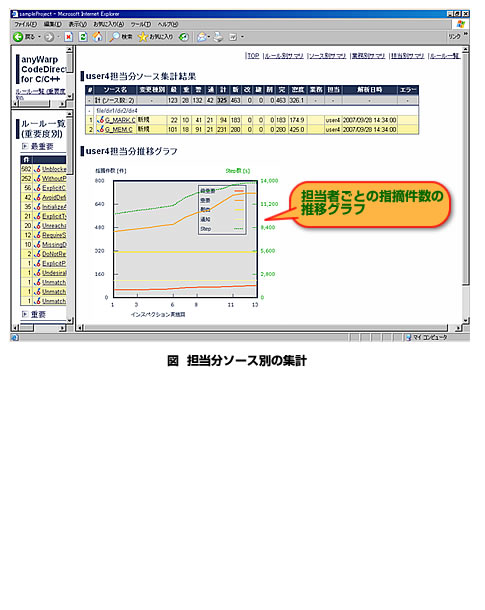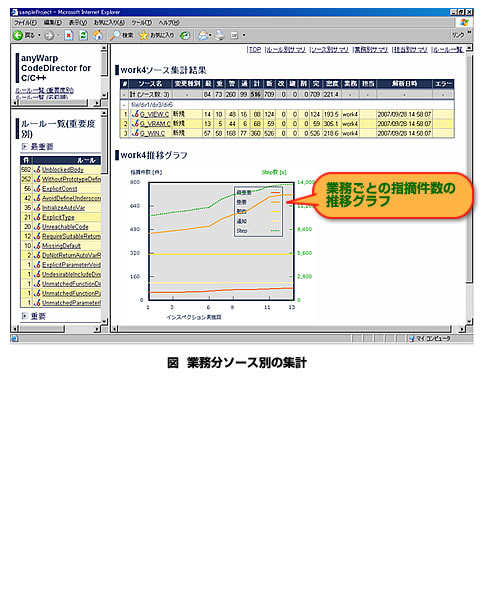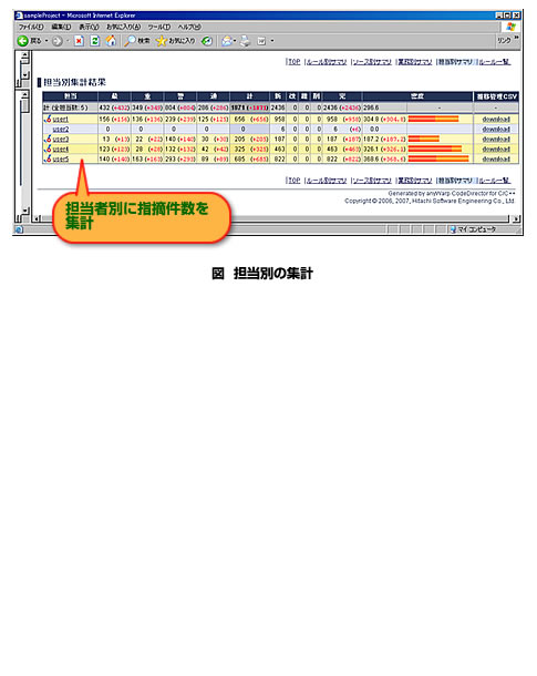指摘結果を多彩な切り口で集計しますので、プロジェクトを多角的に分析することができます。 また、集計結果を蓄積することができるので、プロジェクトの品質の改善状況を知ることができます。