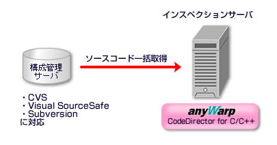 本製品では指定したディレクトリにあるソースコードをインスペクションすることが可能ですが、 CVS、Visual SourceSafe、Subversionから自動でソースコードを取得してインスペクションすることも可能です。