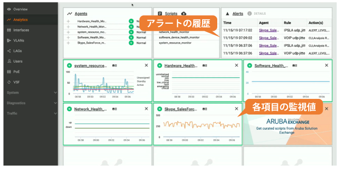 Aruba CXスイッチでは、ネットワークの監視とトラブルシューティングを行うための内蔵型フレームワーク「NAE(Network Analysis Engine)」を搭載。NAE によってリアルタイムにスイッチの状態がモニタリングされ、ネットワーク障害の予兆となり得るイベントを自動で探索および解析します。