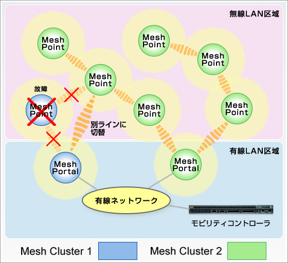 メッシュアクセスポイント機能は、アクセスポイントまでLAN配線ができない場所でもアクセスポイント同士が通信することによって、どこでも無線LAN(Wi-Fi)通信を実現させる機能です。また、同じメッシュ機能でも、アクセスポイントの故障時にも自動切替する機能や屋外対応、暗号・復号化の際パフォーマンスの劣化対策など、Arubaは他社にない優位性があります。