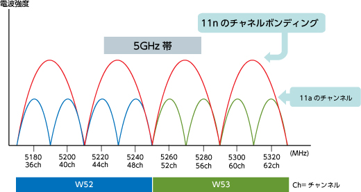 従来のIEEE802.11a/b/gでは、1つのチャンネルが使用する帯域は20MHzですが、IEEE802.11nでは隣接する2つの20MHzチャンネルを束ね、40MHzで通信することにより、2倍以上の伝送速度を実現しています。