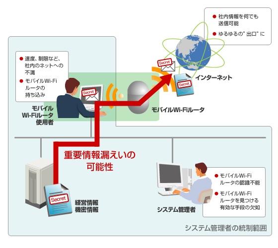 個人や部門が業務効率や検証の為に、社内ポリシー(暗号化条件やパスワードポリシー、利用ログの管理など)を無視した 不正アクセスポイントを社内LANに接続した結果として以下のようなことが発生します。
