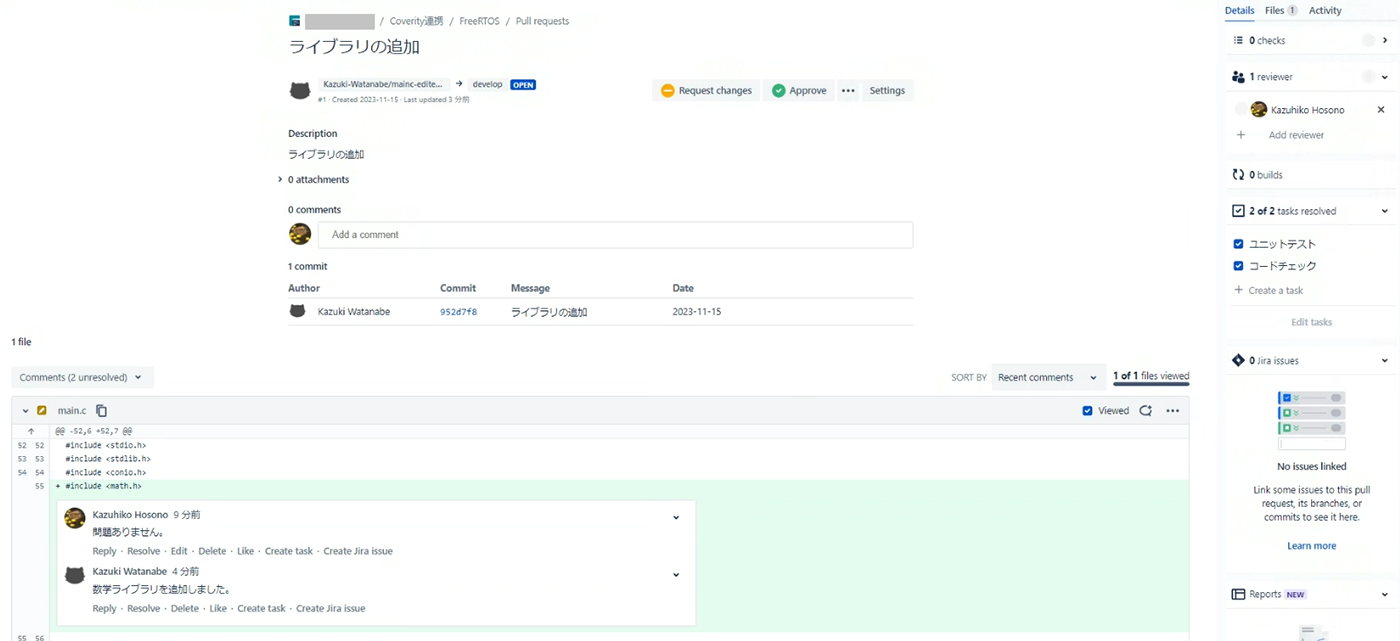 開発したコードをマスターブランチに取り込む前にプルリクエストを用いて、コードレビューを依頼することができます。どの部分を修正したのか画面に詳細表示され、レビューアはインラインでコメントを設定できるため効率的にレビューが可能です。