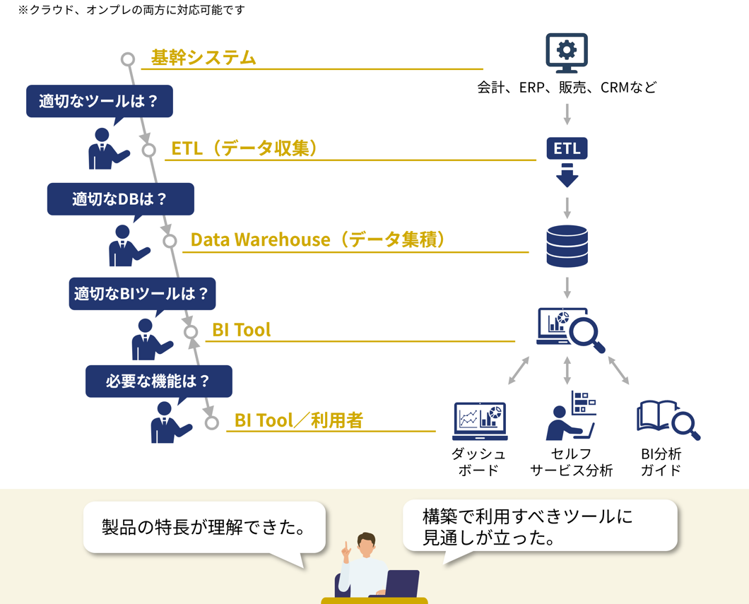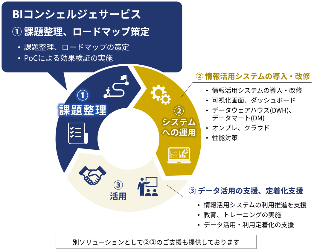 BIコンシェルジェサービスは、情報活用システム整備に向けて、課題整理やロードマップ策定をご支援します。