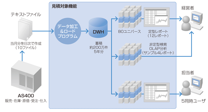 今回の販売管理システム「ADAMS」は、「Business Objects」を使用して構築されたもので、既存のシステムには手を付けずに、目的を達成する即効的な手法が採用されました。つまり、AS400から必要なデータだけを加工して夜間に「ADAMS」へ取り込み、レポートに展開したのです。