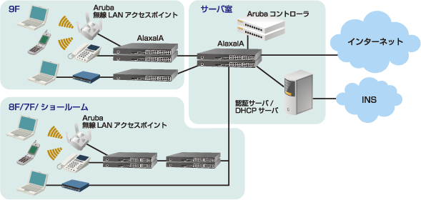 - 全フロアに無線LANを導入したことにより、パソコンを自席から打ち合わせコーナーや会議室に容易に持ち運ぶことが可能になりました。さらに、違うフロアに移動しても認証サーバが自動認識するため再設定等の手間が無く、実務が継続できる利便性が社内で評価されています。