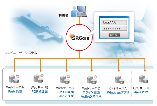 今回販売を開始する「SRGateクライアントエージェント」は、これまで多くのシングルサインオンを実現する製品がWebシステムのアプリケーションしか対応していなかったものを、クライアントサーバーシステムのアプリケーションにも対応することで、従来型の業務システムにも1回のログインで認証が可能となります。また、各業務アプリケーションを修正する必要がないため、安価にシングルサインオン認証を実現できます。ユーザーはクライアントPCに「SRGateクライアントエージェント」をインストールするだけで利用することが可能です。さらに、システム管理者による一括管理を実現するためのLDAP(*1)による認証システムの構築(別途サーバーにDBの構築が必要)を行うことも可能です。