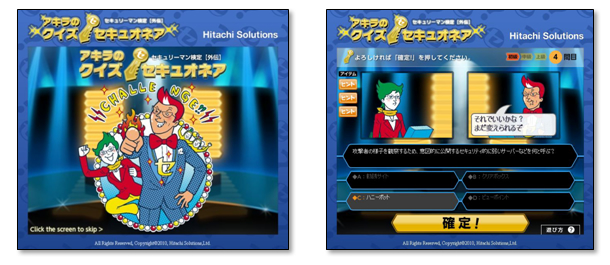 今回公開する「アキラのクイズセキュオネア」は、これまで公開してきた好評企画「セキュリーマン検定」のリニューアル版で、情報セキュリティに関する4 択形式の問題を15 問連続で正解することで、プレゼントに応募できる企画です。5 問連続、10 問連続の正解でもプレゼントに応募できます。ただし、途中の問題で不正解となると、その時点で終了となり、プレゼントへの応募ができなくなります。問題は、情報セキュリティに精通した、日立ソリューションズ プラットフォームソリューション企画部と人財教育部が監修しています。今話題の情報から、知識を必要とする問題まで幅広く網羅しており、初心者から上級者まで楽しめる内容になっています。携帯電話やiPhone からも同じ問題に挑戦することができ、各問題の解説を含め、情報セキュリティをいつでもどこでも、気軽に学ぶことができます。