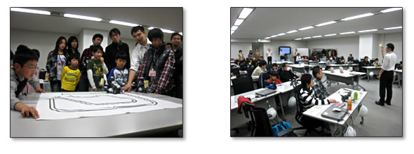 当日は、親子で助け合いながらプログラミングし、お父さんやお母さんの仕事の一端を体験することで、仕事への理解が深まるなど、家族のきずなを深める場となりました。プログラミング終了後には、各自が作成したプログラミングでロボットを動かす競技大会を行い、参加者たちは歓声をあげて応援しあうなど、大盛況のうちに終了しました。