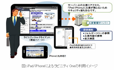「iPhone」の急速な普及に伴い、お客様からは「ラビニティ One」に保管した自社内の文書を、出張先や会議室などの自席以外の場所から「iPhone」を活用して手軽に確認したいという要望が高まっています。