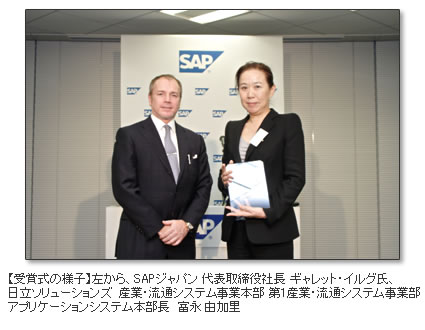 株式会社日立ソリューションズ(本社:東京都港区、取締役社長:林 雅博/以下、日立ソリューションズ)は、SAPジャパン株式会社(本社:東京都千代田区、代表取締役社長:ギャレット・イルグ/以下、SAPジャパン)の「SAP AWARD OF EXCELLENCE 2011(*1)」の中から、2010年におけるSAP BusinessObjectsのチャネル販売において、売上高が最高位の実績を上げた企業に贈られる「ベスト・チャネル・パフォーマー for BusinessObjects」を受賞しました。日立ソリューションズは、昨年の「SAPビジネスオブジェクツBIPアワード」の受賞に引き続き、2年連続で受賞しています。