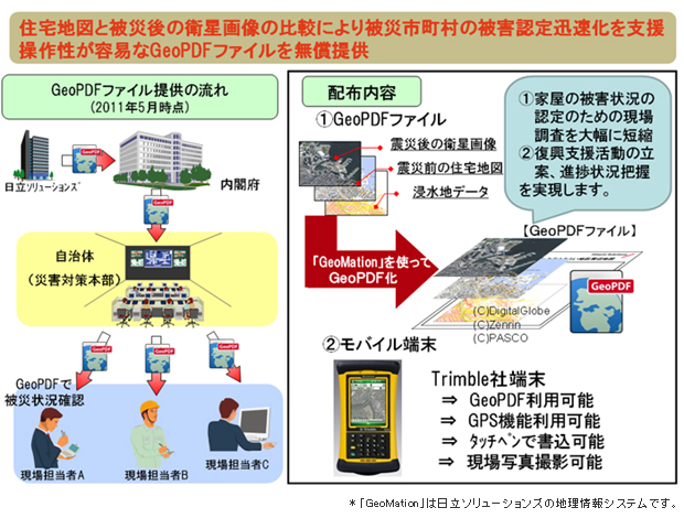 株式会社日立ソリューションズ(本社:東京都品川区、取締役社長:林 雅博/以下、日立ソリューションズ)とWistron Information Technology & Services Corporation(本社:台北市、取締役社長:蕭清志/以下、ウィツ)は地理情報活用事業(ロケーションインテリジェンス事業)で業務提携し、地理情報システム(GIS)が管理する情報をPDF形式で利用可能にするGeoPDFソリューションを、2011年6月より台湾において順次販売を開始します。販売に先立ち、5月25日には台北市にて台湾経済部工業局の周副局長などをはじめ、政府の方々向けに製品発表会を行います。本ソリューションの導入により地理情報の操作や現場への持ち出しが容易になり、地理情報の利用機会が拡大します。特に危機管理分野における利用を見込んでいます。