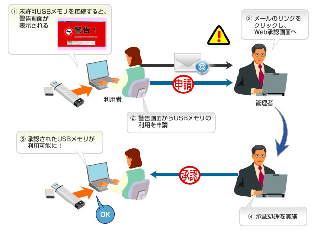 今回販売を開始する「秘文ME Alert Agent」を、持ち出しを制御する「秘文AE Information Fortress」が導入されている環境に追加導入することで、未許可のUSBメモリが接続されると利用者へ警告メッセージを出すとともに、管理者へ通報メールを送付することができます。これにより、利用者が未許可のUSBメモリを接続するたびに注意を喚起することで、セキュリティ意識を向上させることができます。また、申請・承認を行うコンテンツ承認基盤「ContentsGate」と組み合わせることで、接続が必要なUSBメモリを、その場で申請・承認の手続きが可能となる一連のシステムを構築できます。これにより、未許可であっても業務などでどうしても使用しなければならないUSBメモリを迅速に接続できるため、利用者の利便性向上を図ることができます。