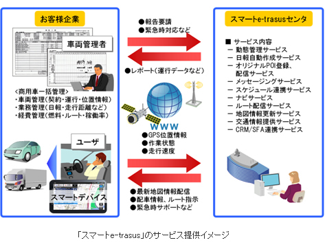 「スマートe-trasus」の各メニューを組み合わせることにより、業種毎に適したサービスを実現することができます。サービスとしては、車両管理(動態管理、ルート配信、メッセージングなど)、地図情報更新、交通情報提供などがあります。今後もセキュアリモートアクセスサービス、文書管理などを順次提供していく予定です。また、対象となる業種は、運送業・サービス業を始めとし、商用車を利用する医薬情報担当者向け、公共機関向けなどに拡大していく予定です。