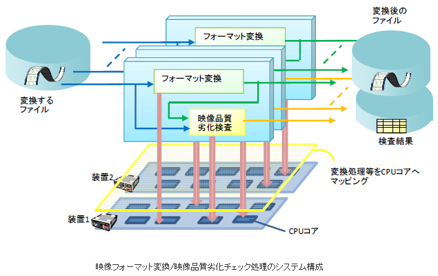 映像ファイルのフォーマット変換とNHK のノウハウに基づく映像品質劣化チェックを同時に行うことで、フォーマット変換と映像品質劣化チェックをその都度行うことに比べ、映像制作の時間短縮を図ることができます。さらに、日立ソリューションズの独自の映像信号並列処理技術によりマルチコアでの高速化に最適化すると同時に、1 つの処理を複数の装置で並行実行することで高速化を実現しました。