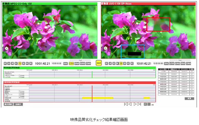 映像品質劣化チェック結果確認用の画面上で、映像品質劣化箇所のタイムライン上の時間位置、(黄色で表示)、プレビュー画面上の空間位置(分割画面の四角枠で表示)、および各分割画面内でエラー値の大きい点の位置([ ]で囲った枠で表示)が表示されるため、映像品質劣化箇所を容易に特定できます。また、変換前/変換後の映像ファイルを結果確認用の画面上で同時に見較べることで映像劣化箇所を目視で確認できます。変換前/変換後の映像は、SDI モニタ(*2)でも同時に確認することができます。