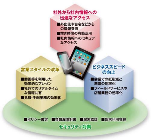 「スマートフォン&タブレット活用ソリューション」は、以下の3つの業務シーンとそのセキュリティー対策に区別され、それぞれの特徴は以下の通りです。