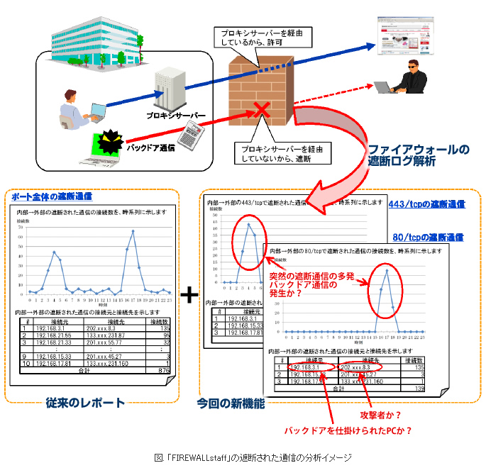 今回、販売を開始する「FIREWALLstaff」は、ポート番号単位でファイアウォールが外部へのアクセスを遮断した通信の接続元と接続先を集計できる機能を追加しました。これにより、バックドア通信で利用されることが多いポート番号であるWebアクセスのHTTPや個人情報などを入力するHTTPSなどのレポートを集中的にチェックすることで、接続先情報から攻撃者を特定したり、接続元情報からバックドアを仕掛けられたPCを早期に発見することで、標的型サイバー攻撃対策の出口対策を強化します。また、「FIREWALLstaff」のログ解析レポートは、日本語でわかりやすく記載されているため、専門知識がなくても、チェックを行うことが可能です。