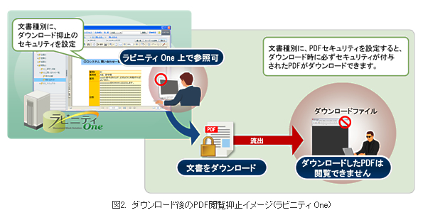 また、「ラビニティ One」Web機能の最新版では、文書管理サーバーの文書に、ダウンロード後のPDF参照抑止機能にチェックを入れておくことで、該当するPDFデータを故意にダウンロードして参照しようとしても、文書の内容を非表示にして参照不可にする機能を追加しました。これにより、研究報告書などの重要な文書を不正にダウンロードされた場合に、文書の不正コピーや添付メール配信などによる情報の漏えいを防ぐことができます。