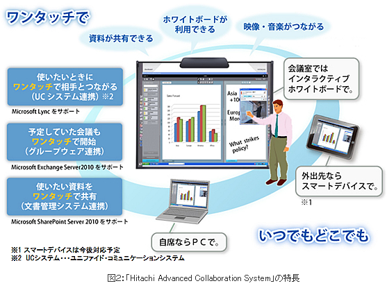 そこで、日立ソリューションズは「Hitachi Advanced Collaboration System」の提供を開始します。本システムは、書き込みや資料共有の操作性が優れた当社のホワイトボードソフトウェアに、ユニファイドコミュニケーション(UC)基盤「Microsoft Lync」のプレゼンス情報、音声通信、映像共有の機能などを統合し、効率的な協働作業を実現します。これにより、通常、別々のシステムで提供される協働作業に必要なすべての環境を、ユーザエクスペリエンス設計された分かり易い一つのインターフェースで利用できるようになります。また、会議や日常のコミュニケーションなど利用シーンを選ばず、ワンタッチ操作でそれぞれの機能を使うことが可能です。