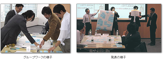 ワークショップでは社員が8グループに分かれ、まずは「かものはしプロジェクト」がファシリテーターとなり、世界の経済格差のしくみを理解するワークショップ「貿易ゲーム」(※1)によって、広がる経済格差への危機感を体感したのち、「途上国支援ケーススタディ」に移行し、途上国支援の現場で使われている手法を用いて途上国における課題を抽出し、その解決に向けた樹形図(ツリー)を作成しました。それをもとに各グループが、その課題をITを活用していかに解決できるかを討議し、ITを駆使した遠隔医療、教育支援、現地のエンパワーメントなどのソリューションを提案しました。