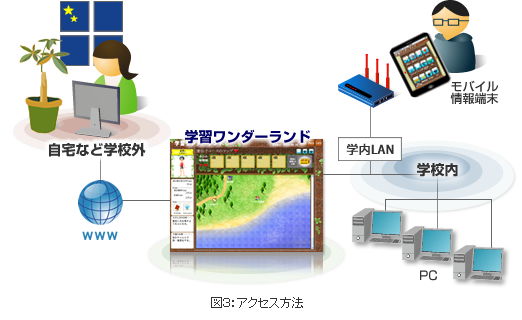 本システムは、学校内においてはモバイル情報端末やPCから学内LAN経由のアクセス、また、自宅など学外からはインターネット経由でのアクセスに対応しています。