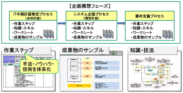 「HyThology」は、IT中期計画策定プロセスからシステム企画プロセス、要件定義プロセスについて、日立ソリューションズおよび日立グループの実践から得られた技法ノウハウや人間中心設計などの当社の強みとする技術を、要求工学知識体系REBOKに基づき体系化したものです。これまで、個々の部門で蓄積したノウハウや個人の経験・スキルで進められてきた超上流工程を標準化し、実用を主眼に置いて、方法論のみならず、作業ステップ、成果物を作るためのワークシート、成果物のサンプルを整備しています。