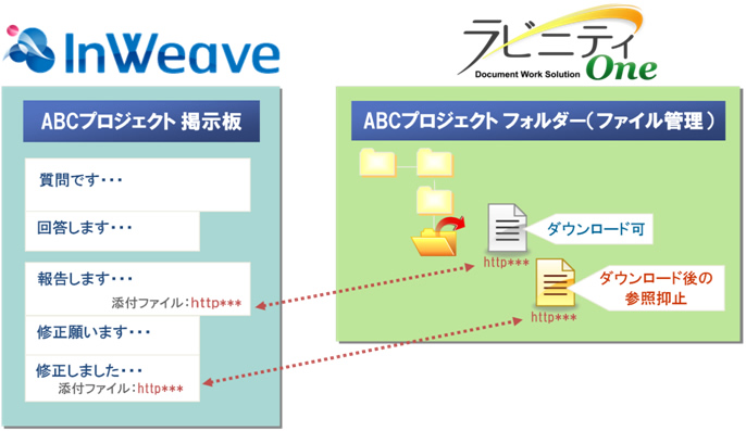 「ラビニティOne」に格納されたファイルを「InWeave」のSNSや掲示板上の限定されたメンバーに公開できるため、関係者外への情報漏洩を防止します。また、社内へ情報を通知・通達する際、「ラビニティOne」に格納された社外秘扱いのファイルに印刷やダウンロード後の参照抑止を設定して「InWeave」上に公開することで、メールを利用したコミュニケーションよりも、確実な外部への情報漏洩の防止と安全な情報の公開を同時に実現できます。これにより、離れた場所にいるメンバーとの安全な情報共有が可能になります。