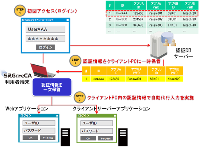 「SRGateクライアントエージェント」の最新版では、初回ログイン時に認証DBサーバーから認証情報をクライアントPCに一時保管します。そのため、従来業務システムへのアクセスごとに必要であった認証DBサーバーの認証情報へのアクセスが不要となります。
