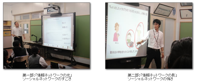 対して第二部では、「ソーシャルネットワークの怖い、危ないところ」をテーマに、間違った情報や個人情報を安易にソーシャルネットワーク上に公開したことで社会から制裁を受ける恐ろしさや、いたずら心で公開した動画によって非難が集中し大問題へと発展した実際の事例を紹介することで、ソーシャルネットワークのすごさや楽しさ(光)と背中合わせの危険や怖さ(影)を実感してもらいました。最後は、顔の見えないソーシャルネットワークの世界も、私たちの現実世界と全く同じであり、情報発信をする際にはその影響度合いについてよく考えてから行うべきであるということを学んでもらいました。