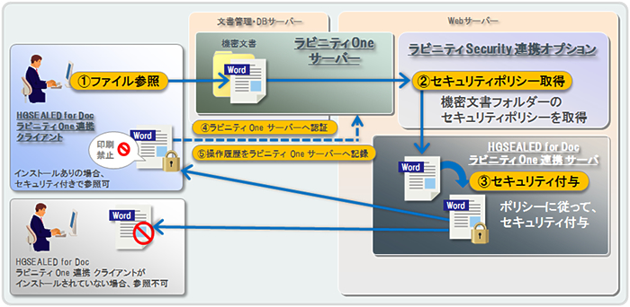 これまでの「ラビニティ One」では、登録されたWordなどの文書ファイルを一旦PDF化してセキュリティを設定していましたが、「ラビニティSecurity 連携オプション」を利用することで、ユーザーは、「ラビニティ One」に登録している契約書や見積書などの文書の種類ごとに、参照、印刷の制限や配布後の閲覧抑止などの、より厳格なセキュリティをMicrosoft Officeファイルの形式で設定することができるようになります。これにより、設定されたセキュリティ条件に基づき、「HGSEALED for Doc ラビニティ One連携」のクライアントアプリケーションがインストールされている特定のPCで、文書ファイルの利用を制限することが可能となります。また、ファイルの参照や印刷などの操作ログをサーバーへ記録することで、これまでよりもきめ細やかなセキュリティ対策を講じることができます。