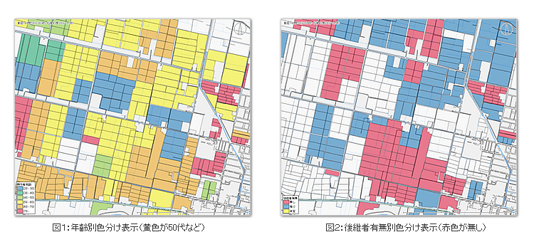 経営者の年齢、後継者の有無、経営意向を圃場の関連情報として「GeoMation Farm」上で管理し、地図の圃場別に色分け表示します。地域農業の現状を視覚的に把握することが可能です。