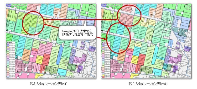 「GeoMation Farm」に蓄積した情報から、5年後などの想定年と基準年を指定して、農地流動シミュレーションを行うことが可能です。