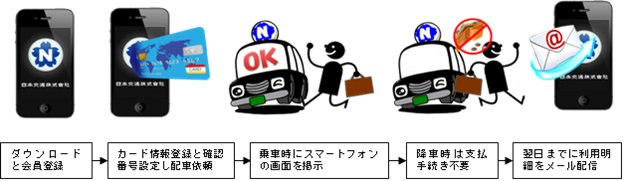 日本交通株式会社(本社:東京都北区、社長:川鍋 一朗、以下:日本交通)と、日本交通の決済代行を行う株式会社日立ソリューションズサービス(本社:東京都品川区、社長:赤崎 修、以下:日立ソリューションズサービス)、株式会社ジェーシービー(本社:東京都港区、社長:川西 孝雄、以下:JCB)、シティカードジャパン株式会社(本社:東京都品川区、社長:マルコ・レヴェルディート、以下:シティカードジャパン)および三井住友カード株式会社(本社:東京都港区、社長:島田 秀男、以下:三井住友カード)は協力し、スマートフォンでタクシーが呼べるアプリ「日本交通タクシー配車」にて、事前にクレジットカード情報※1(JCB、AMEX、Diners、Visa、MasterCard)を登録し配車依頼をすると、降車時に支払い手続きが不要になる新しいタクシー決済サービスを、2012年12月5日(水)より開始いたします。