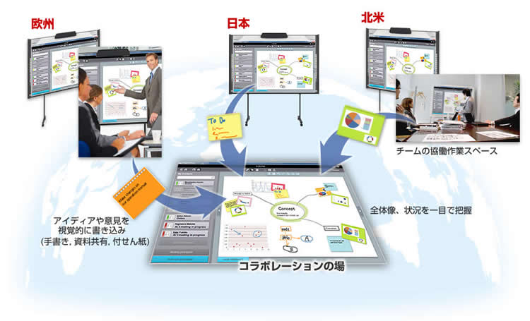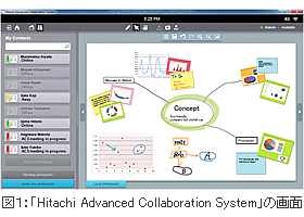 そこで、日立ソリューションズでは、集合会議や分散拠点間など参加者の場所にとらわれず、操作性の優れた統一インターフェース上で、音声・映像・資料・ホワイトボードが共有できる次世代コラボレーションシステム「Hitachi Advanced Collaboration System」の販売を、日本と米欧市場に向け2012年3月1日から開始しました。このたび、本製品に付せん紙機能を追加することでコラボレーションのより一層の活性化を支援することができるようになり、Time-to-Marketの短縮に貢献します。