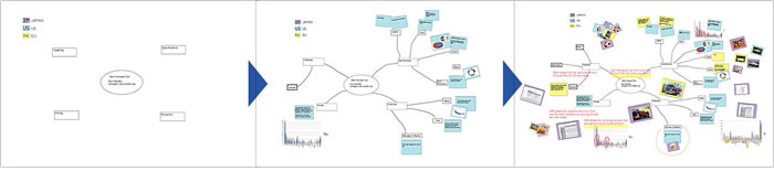 利用者は、「Hitachi Advanced Collaboration System」のホワイトボードを、情報収集から整理、意思決定までを行うコラボレーションの場として活用することができ、必要な情報を1か所に集約することで、意思決定の迅速化が図れます。また、文字に加えて、写真や画像などをホワイトボードや資料に投稿できる付せん紙の機能によって、意見やアイデアをよりビジュアルに整理、集約することが可能です。付せん紙によりビジュアルに表現されたコメントが、新しい気づきを促し、より活発で充実したコラボレーションを実現できます。