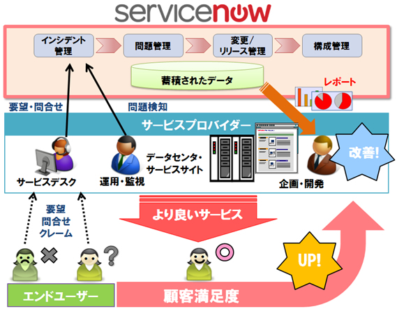 「ServiceNow」は、世界標準のITサービスマネジメントを実現するための体系的なベストプラクティスである「ITILver.3」をベースに設計されたSaaS型のクラウドサービスです。エンドユーザーのリクエストや問い合わせ、その対応状況を集約してレポート出力し、世界中の関係者との共有を実現することでサービス改善を支援します。また、業務プロセスの標準化と自動化により、対応の迅速化と業務の改善を図ります。