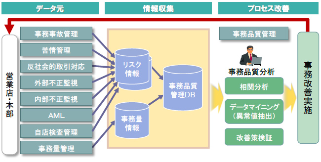 本ソリューションは、事務事故管理・苦情管理や反社会的取引対応、不正監視、AML 、自店検査管理、事務品質管理等のこれまで独立していた業務システムを統合することにより、事務管理の一元的なデータベースを構築し、多角的でより相関的な分析を実現します。