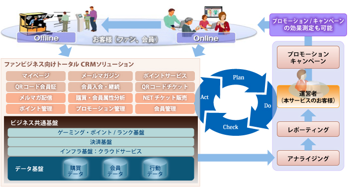 近年、エンターテインメントやスポーツに加え、サービス業や小売業などの企業が、顧客のリピート購買の増加を目的に、ファン作りのためのプロモーション活動に取り組んでいます。しかし、会員管理、マイページやメールマガジン、キャンペーン、店舗でのグッズ販売など、さまざまな活動が個々に行われているため、会員個人のニーズ分析やプロモーション全体の効果を測定できず、継続的な改善プロセス(PDCAサイクル)に取り組めないことが課題となっています。