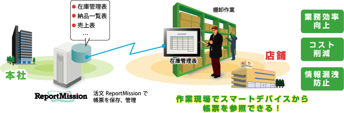 たとえば、流通業の店舗では、在庫管理表や納品一覧表、売上表などをスマートデバイス上で閲覧しながら作業ができたり、製造業の工場では、スマートデバイスを使って作業指示書の確認ができたりするようになります。これにより業務効率を向上し、ペーパーレス化によるコスト削減や情報漏洩防止を実現します。