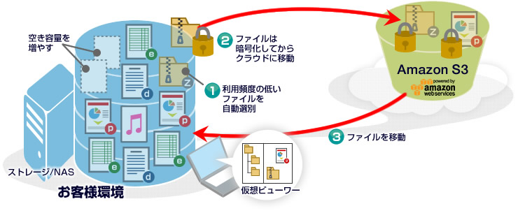 Amazon S3へファイルを移動しても、仮想ビューワーにより、従来どおり企業内のストレージにあるかのように見えます。アクセスすると、即時にAmazon S3から企業内のストレージに戻り、利用可能となります。