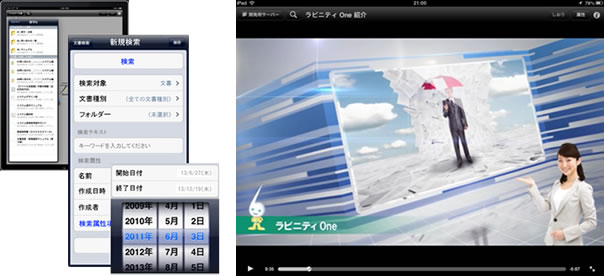 株式会社日立ソリューションズ(本社:東京都品川区、取締役社長:佐久間 嘉一郎/以下、日立ソリューションズ)は、文書管理システム「ラビニティ One」で管理している文書をiPad/iPhoneからも参照できるようにする「ラビニティ One iPad連携オプション」の最新版の販売を、4月1日から開始します。最新版では、動画再生やPCからと同様に属性などを指定して検索できる詳細検索の機能を追加しました。