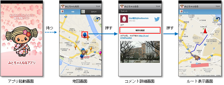 ICT観光サービスはスマートフォンの無料アプリケーション「みとちゃんねるアプリ」により、現在位置を示すナビゲーション地図と連携して観光ガイドなどの情報を表示します。さらにSNS(ソーシャル ネットワーク サービス)の投稿を自動収集する技術を活用し、投稿された情報をナビゲーション地図上や一覧形式などで表示します。また投稿された情報はPCなどのブラウザからも一覧形式で閲覧できます。