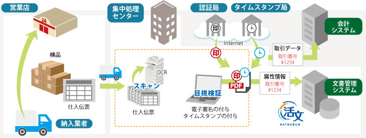 具体的には、「活文CLM」の属性情報による管理機能や検索機能によって、国税関係書類のスキャナ保存要件である「関係書類の備え付け」「相互関連性の確保」「検索機能の確保」に対応します。また、スキャンしたファイルに電子署名やタイムスタンプを付与する仕組みを新たに提供することで、「真実性の確保」にも対応します。